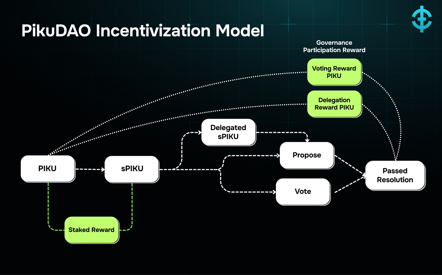The PIKU token serves as an entryway into the PikuDAO governance process. The token itself does not directly confer voting rights. Instead, it functions as the asset that must be staked to participate in protocol governance.