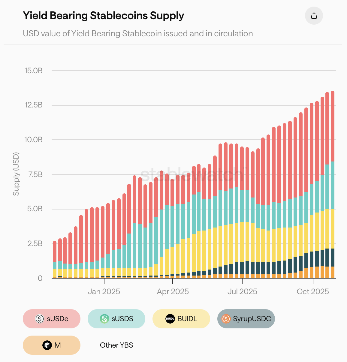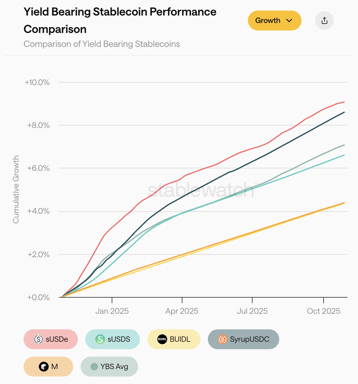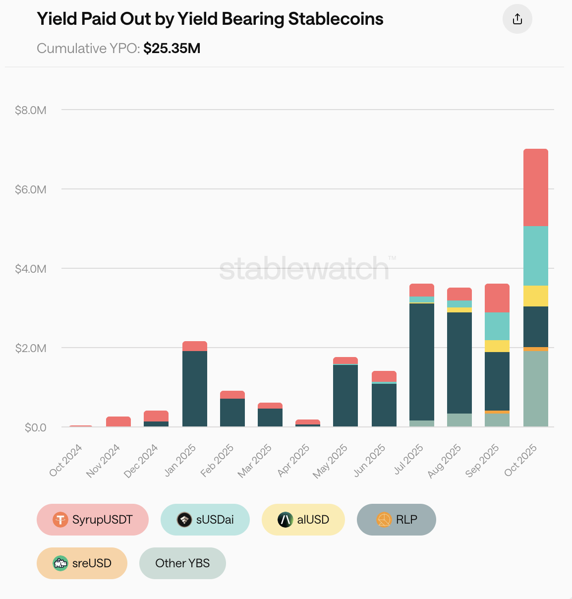 Next, we move from supply metrics to value returned. We track the cumulative Yield Paid Out (YPO) by these stablecoins: a tangible, realized yield that has actually been delivered to asset holders over time. Here you can also see a breakdown of major contributors to the growth of the YPO.