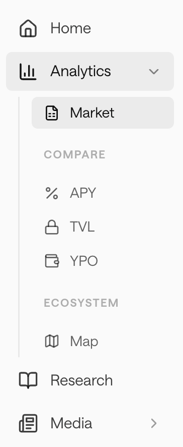 The new navigation sidebar acts as your guide, cleanly separating our tools into logical categories. You will find the brand-new Market overview, the enhanced Compare suite, and Ecosystem mapping, now all in one place. The Market tab is the new heart of our macro-level analytics, housing our most powerful new visualizations. Meanwhile, familiar features, like our APY and TVL comparisons, have been restructured into the 'Compare' section for a more focused experience.