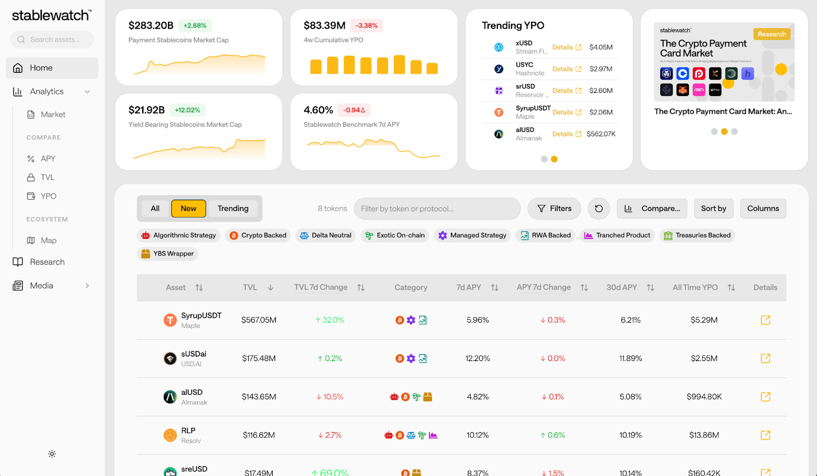 In a single screen, you get an immediate, high-level market snapshot — from the total market cap of payment stablecoins, through the highlights of our recent research, down to trending yield payouts — before drilling down into the granular data that matters in the tables below.