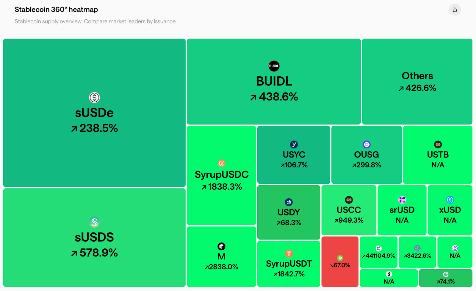 For a bird’s eye view of the market, the 360° heatmap provides a data-driven overview of different stablecoins’ dominance. With this visualization, you can assess the competitive landscape at a glance as it instantly communicates market leadership and recent growth velocity.